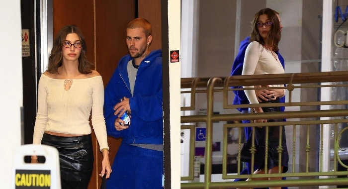 Para la ocasión, Hailey apostó por un look elegante con un top tejido que dejaba los hombros al descubierto y una falda de cuero, mientras que Justin optó por un estilo mucho más relajado con un conjunto deportivo azul.
