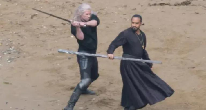 En las imágenes del set, parece que Liam podría estar recreando esa escena para su propia versión del personaje, mientras usa exactamente la misma camisa negra, pantalones, botas, colgante y peluca que Henry usó para la secuencia.